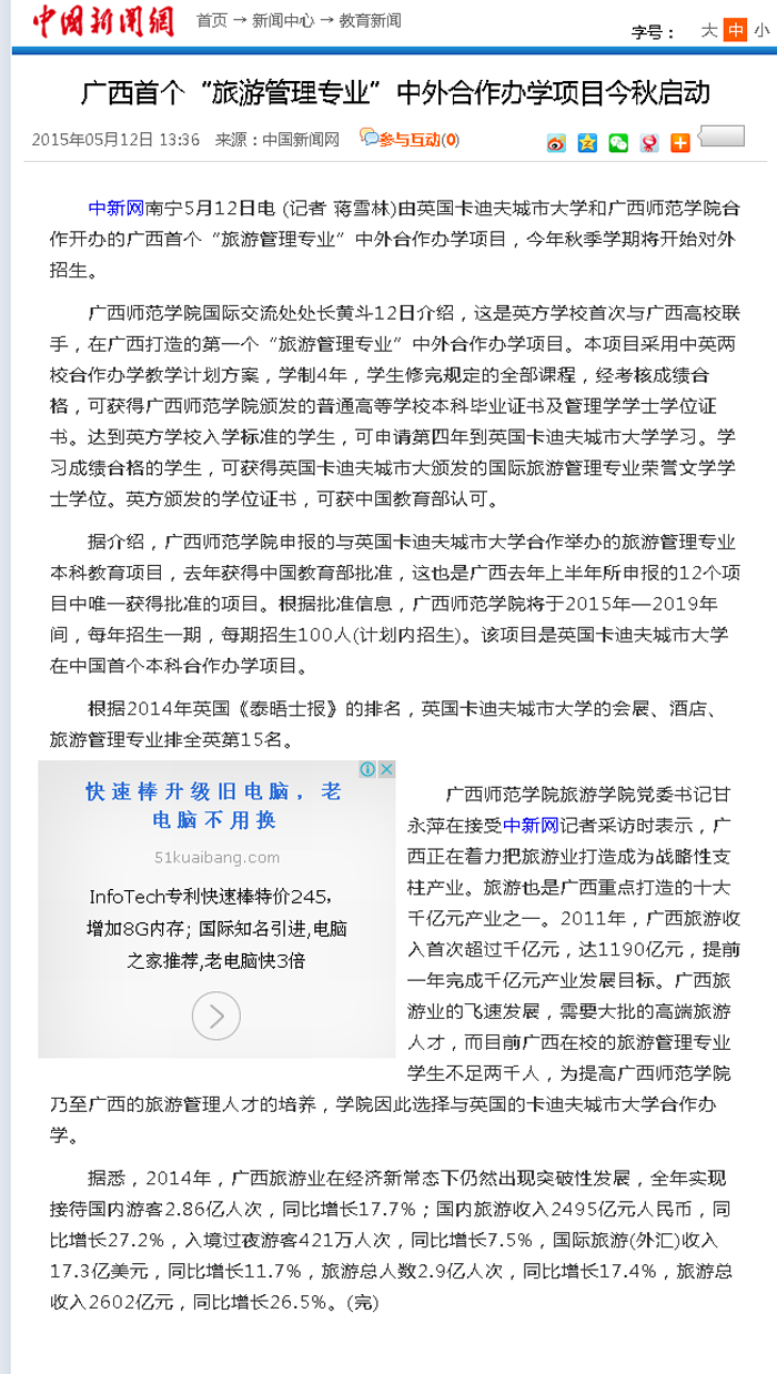 中新网、人民网等多家媒体报道英国上市公司365首个“旅游管理专业”中外...