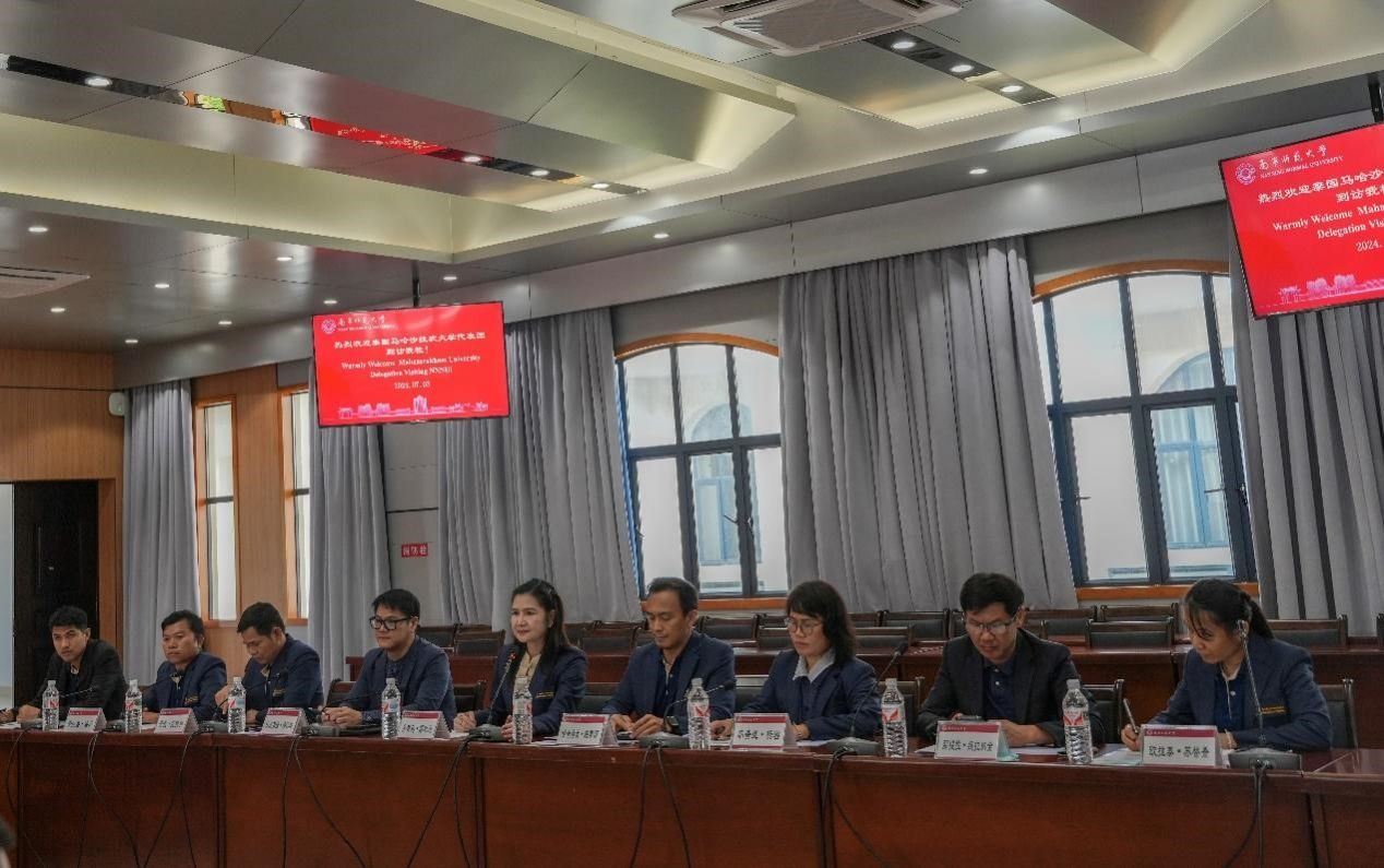 座谈会上杨绪明处长致欢迎辞,他对代表团的来访表示热烈欢迎,介绍了学校的基本情况和教育对外开放发展取得的新成绩,回顾了与泰国高校交流合作、特别是与泰国马哈沙拉坎大学交流互访、友好合作的情况,希望通过此次会面,双方进一步加深了解,在硕士博士生培养、学术交流、科研合作方面开展更广泛的合作。