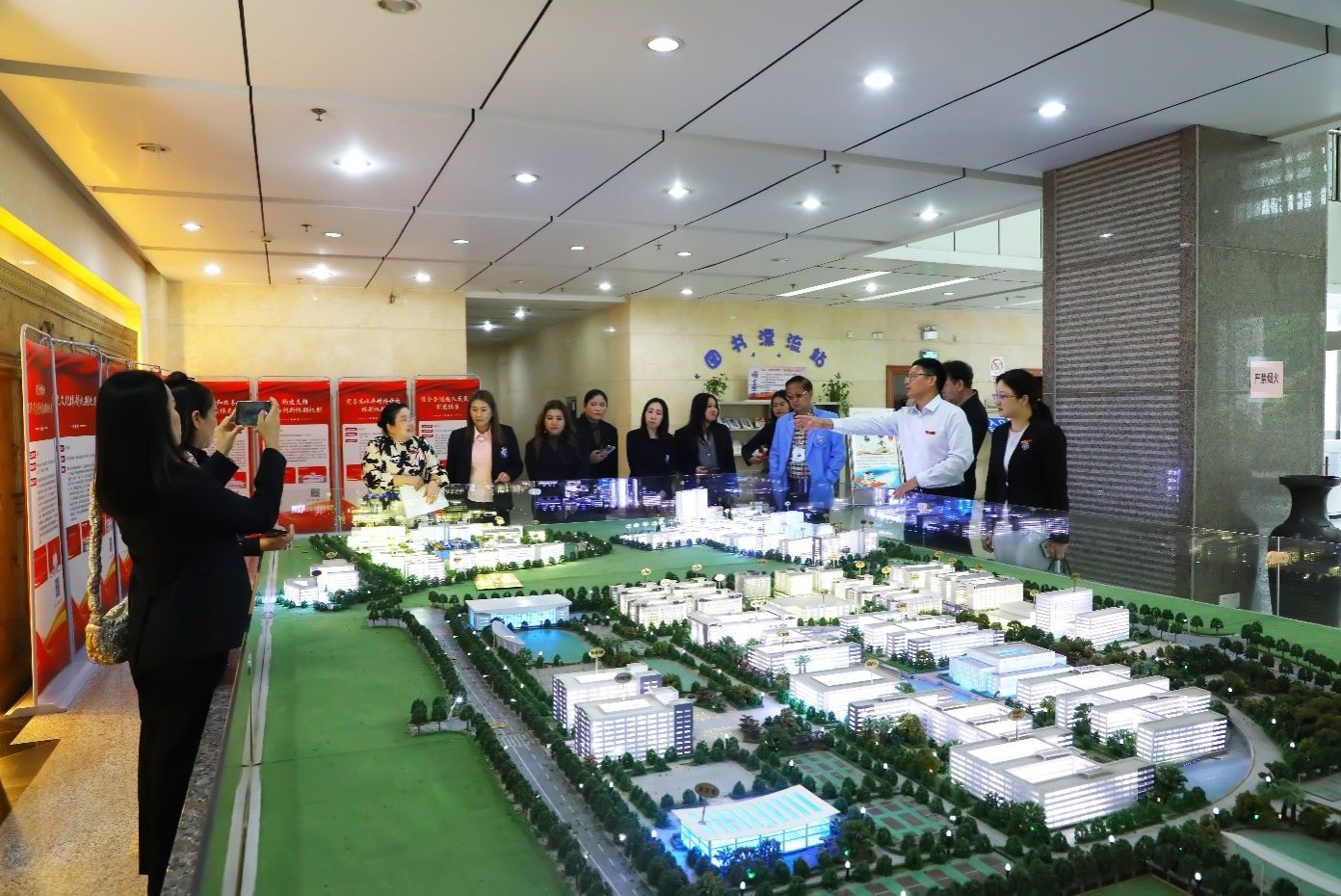 座谈会前,英国正版365官方网站合作处/国际教育学院相关负责人陪同代表团参观了学校沙盘、教师教育展。