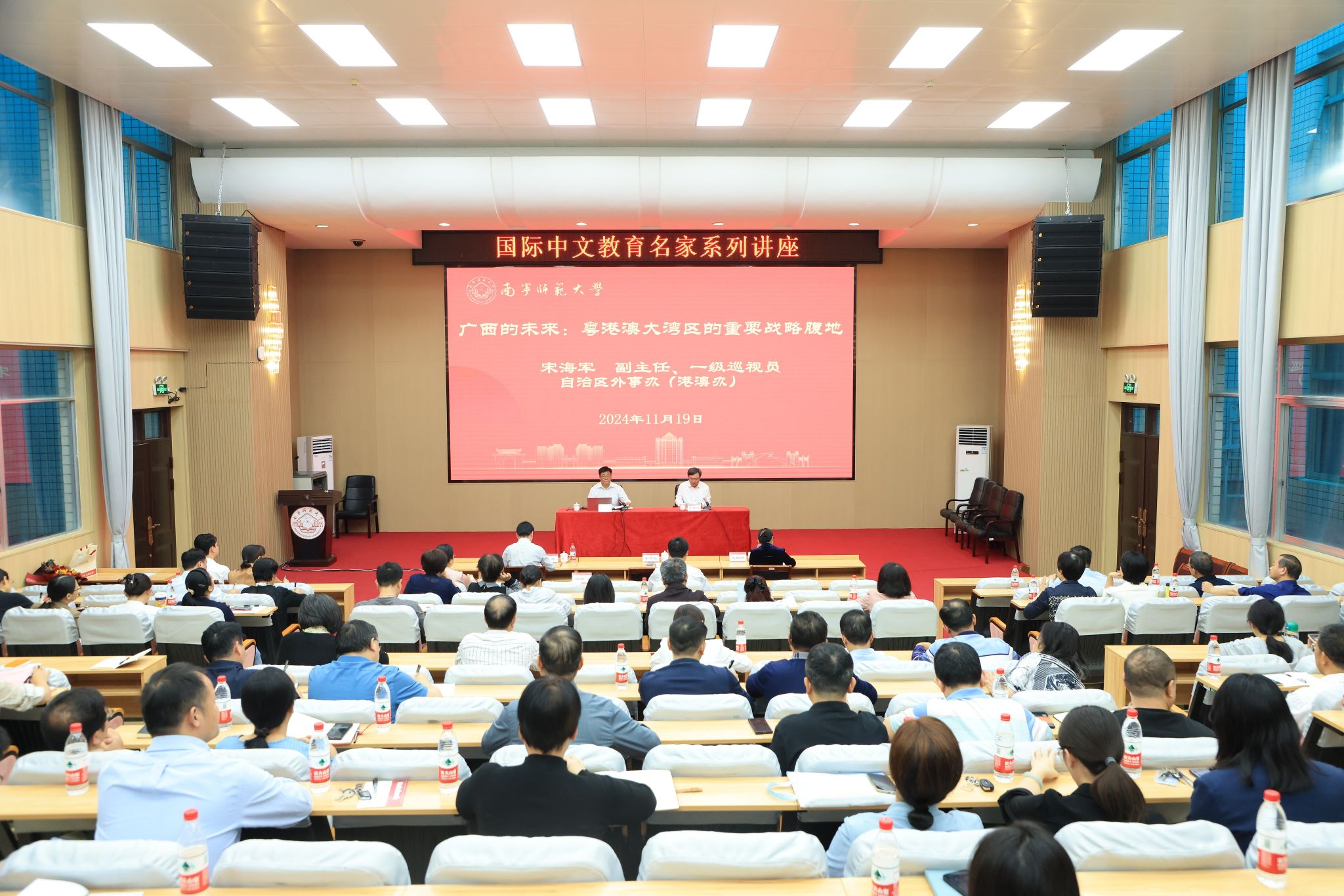 为深入贯彻落实习近平总书记关于把广西打造成为粤港澳大湾区重要战略腹地的重要指示精神,2024年11月19日下午,英国上市公司365邀请自治区外事办公室(港澳事务办公室)宋海军副主任、一级巡视员,在明秀校区文星楼301报告厅作“广西的未来:粤港澳大湾区的重要战略腹地”专题报告。报告会由李传起校长主持,学校肖琦副校长、龙妮娜副校长,全体中层干部、有留学生的学院相关教育管理人员、国际教育学院学生代表共200余人参加。